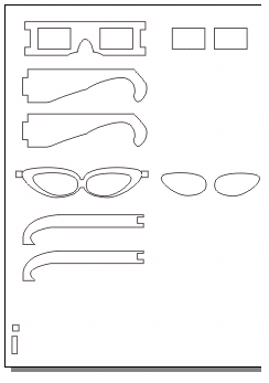 i considered the materials at hand, and thought about using the colored acrylic to create cool 3D glasses that really were red and blue lenses popped into clear frames. designed a mod-squarish one [6" across, hope they fit on a face!], and then thought it might be cute to create a cat-eye one. [honestly, have you ever seen a jackie-o frame or a rhinestone cat-eye on a pair of 3D glasses?] this was my chance to glamourously revolutionize the 3D glasses image and industry. the joints at the temple are where the pieces should snap together. time will tell if the nose and earpieces will fit comfortably.